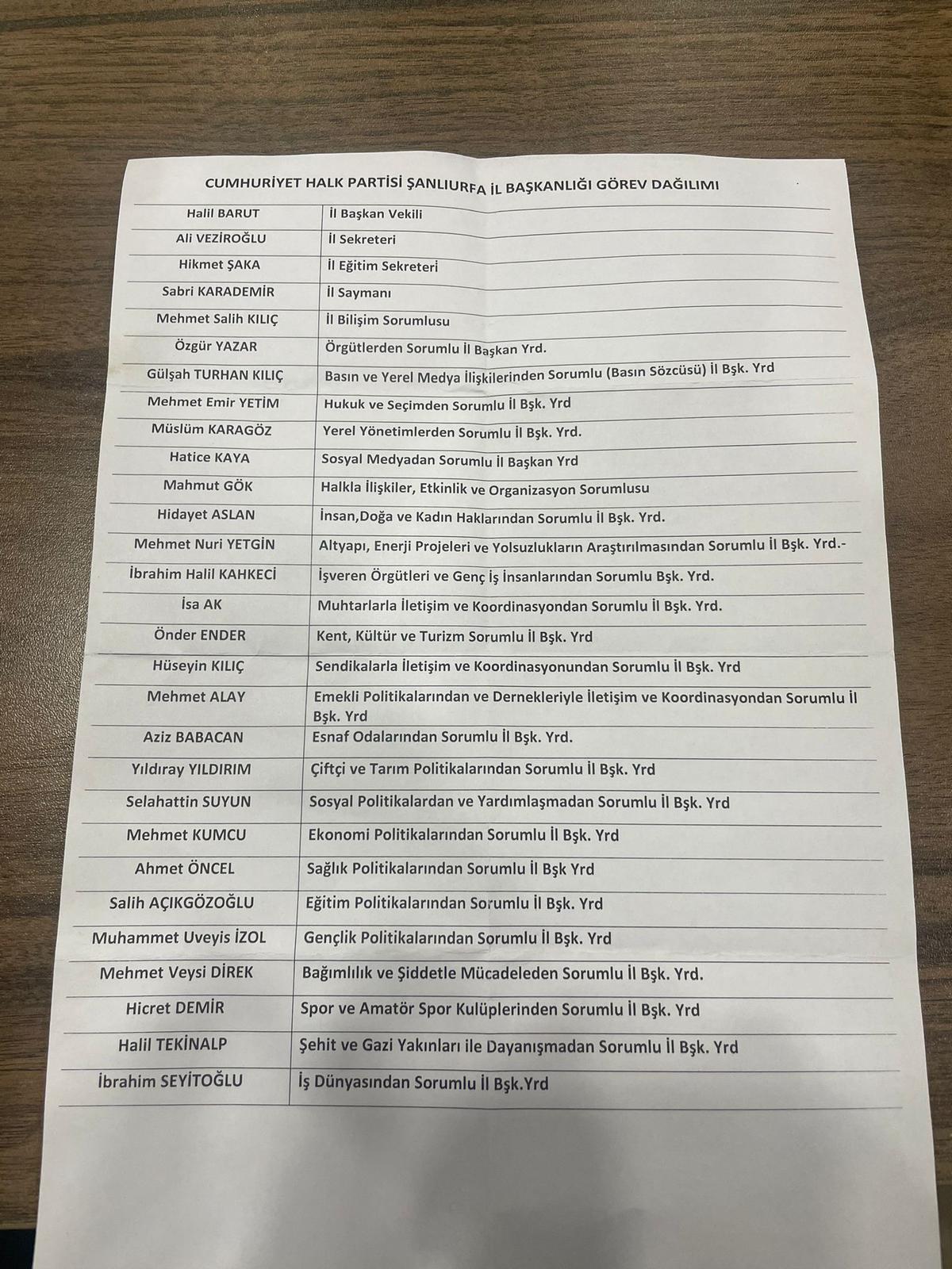CHP Şanlıurfa il yönetiminde yer alan isimlerin görev dağılımları şöyle: