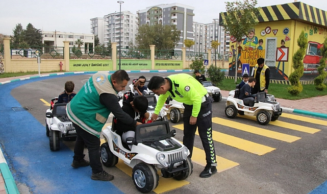 Şanlıurfa Valiliği koordinesinde Haliliye Belediyesi, İl Emniyet Müdürlüğü ve İl Milli Eğitim Müdürlüğü işbirliğinde yapılan programla çocuklara trafik eğitimi veriliyor.
