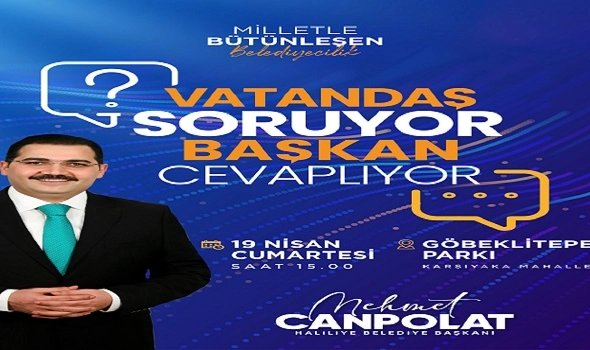 Haliliye Belediye Başkanı Mehmet Canpolat, “Vatandaş Soruyor, Başkan Cevaplıyor” programıkapsamında vatandaşlarla bir araya gelecek. Başkan Canpolat, 19 Nisan Cumartesi günü Göbeklitepe Parkında düzenlenecek olan programda; talep ve önerileri dinleyecek.