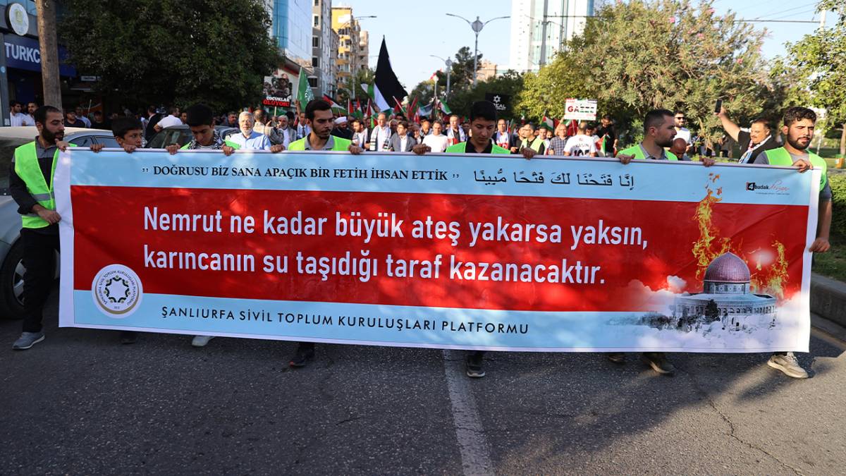 Filistin bayraklarının taşındığı yürüyüşte, "Nemrut ne kadar büyük ateş yakarsa yaksın, karıncanın su taşıdığı taraf kazanacaktır." pankartı da açıldı.