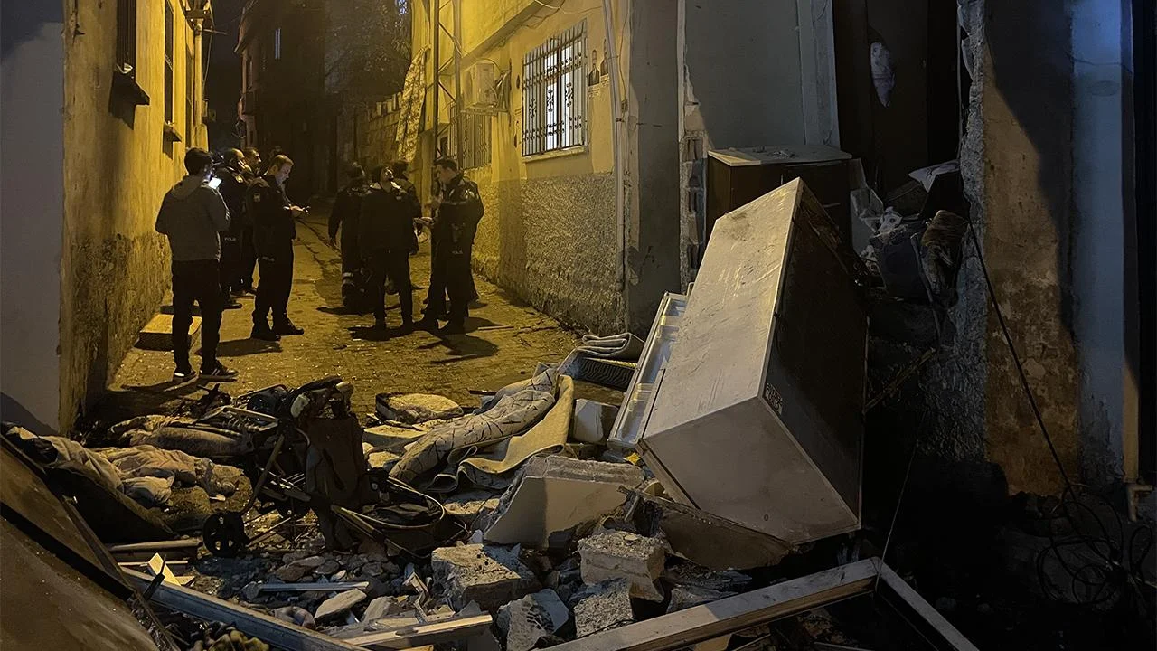 Patlama sonucu, sokağa bakan dış duvarının yıkılmasıyla eşyalar dışarı savruldu, evde büyük hasar oluştu.