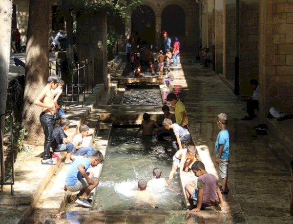 Şanlıurfa’da sıcağın etkisiyle kentin çeşitli noktalarında çalışmakta olan işçiler buz içerisin de bulunan su termoslarını yanlarından ayırmadıklarını belirtti. Çocuklar ise tehlikeye aldırış etmeden süs havuzlarında serinledi.